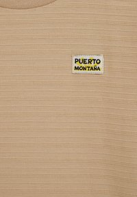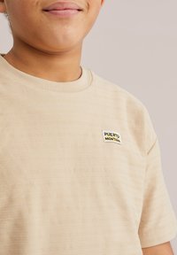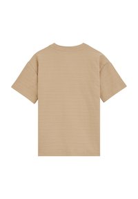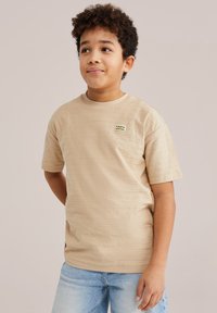 Garçon debout les mains dans les poches, portant un t-shirt beige, un short en denim clair, des chaussettes rayées et des baskets bleu marine sur un fond neutre.