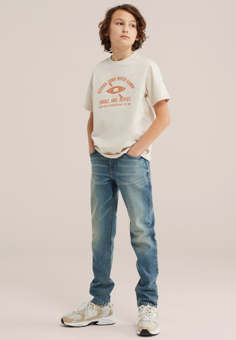 Enfant avec des cheveux bouclés portant un t-shirt beige du camp Cedar Fork River, un jean bleu et des baskets blanches, debout les mains dans les poches.