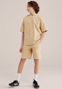 Enfant aux cheveux bouclés debout, les mains dans les poches, portant un t-shirt et un short beige Blue Ridge, des chaussettes blanches et des baskets noires.