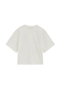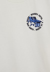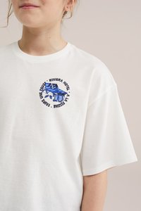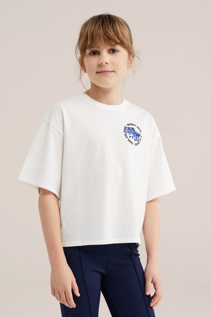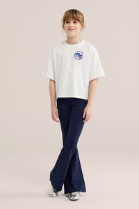 Jeune fille aux cheveux châtain clair portant un t-shirt blanc surdimensionné avec un petit motif bleu et un legging marine, sur un fond uni.