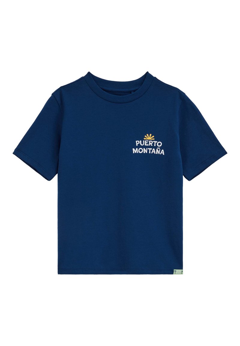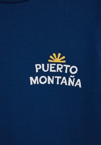 T-shirt en coton bleu foncé à manches courtes avec col rond, affichant le texte blanc "PUERTO MONTAÑA" et un petit graphisme de soleil jaune sur la poitrine gauche.