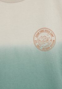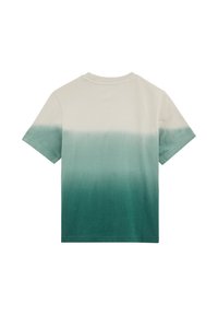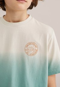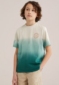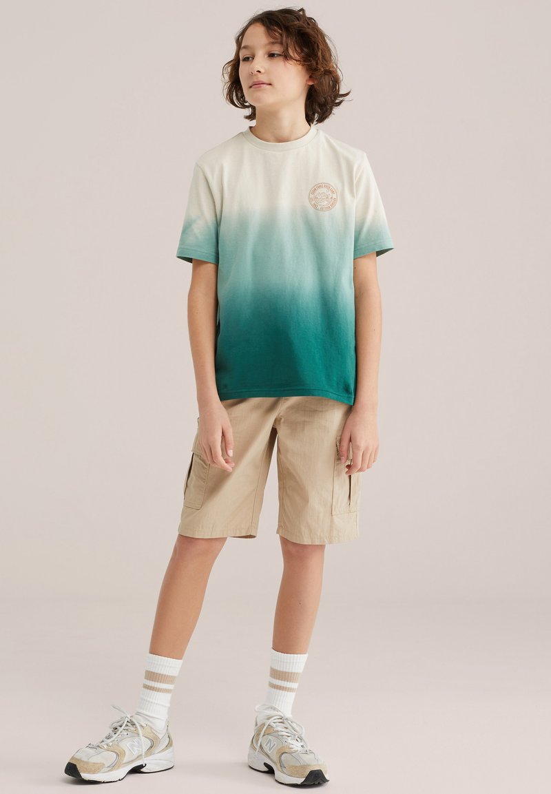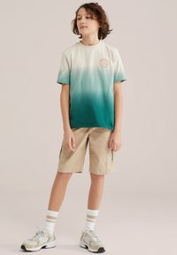 Garçon portant un t-shirt ombré bleu sarcelle et blanc, un short cargo beige, des chaussettes blanches avec des rayures beiges, et des baskets beige et blanches, debout devant un fond uni.