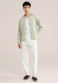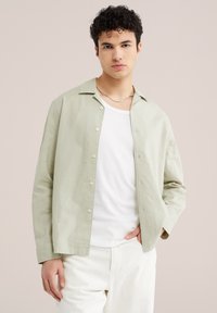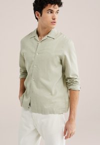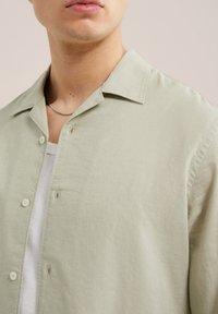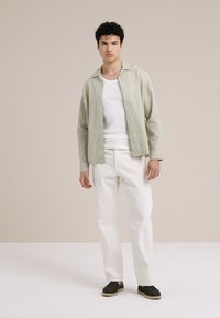 Chemise boutonnée vert olive clair à manches longues, coupe ajustée, avec des boutons blancs. Portée par-dessus une chemise blanche, associée à un pantalon beige.