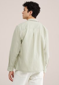 Chemise button-up vert clair avec une poche poitrine, manches longues et col classique, portée par-dessus un t-shirt blanc et associée à un jean bleu.