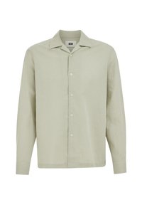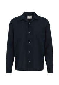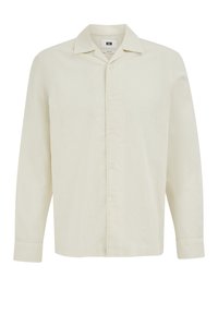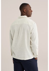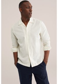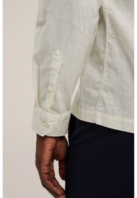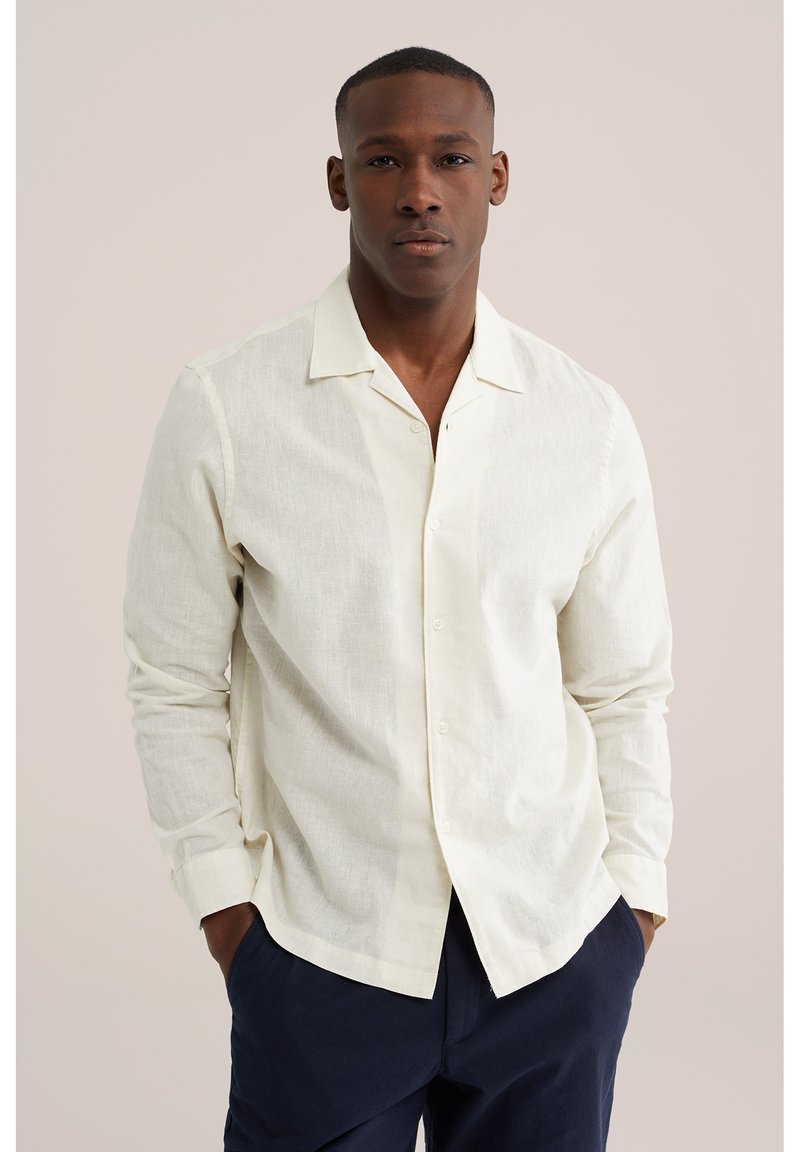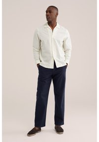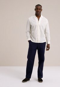 Homme portant une chemise à manches longues, de couleur blanc cassé, avec col ouvert et un pantalon bleu marine, debout les mains dans les poches devant un fond uni.