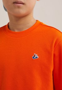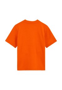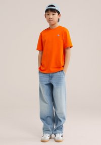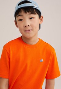 Garçon portant un t-shirt orange vif à manches courtes avec un petit logo et une casquette bleu clair portée à l'envers, debout devant un fond uni.