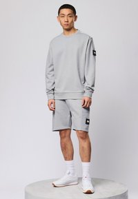 Homme portant un sweat-shirt à manches longues gris clair avec un patch noir sur la manche gauche, assorti à un pantalon gris clair.