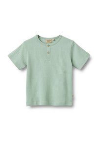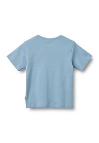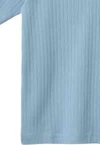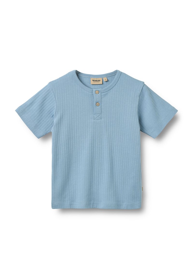 T-shirt en coton côtelé bleu clair avec manches courtes, col rond et patte de boutonnage avec deux boutons.
