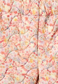 Pantalon matelassé à motif floral pastel, doté d'une ceinture élastique et de poignets côtelés, principalement dans des tons pêche et rose clair.