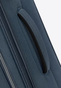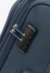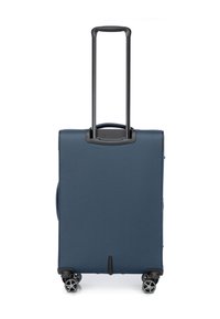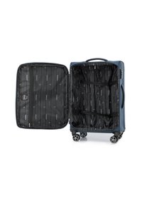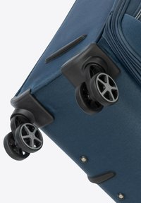 Valise bleue à roulettes avec un tissu texturé, deux poches zippées à l'avant, une poignée rétractable et quatre roues multidirectionnelles.