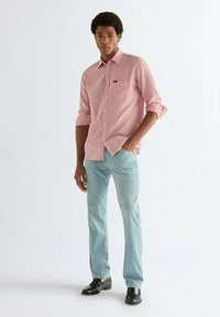 Homme portant un jean slim bleu clair, des mocassins en cuir noirs et une chemise rose boutonnée, debout devant un fond uni.