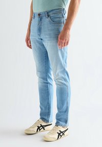 Homme portant un jean slim bleu clair et des baskets crème avec des rayures noires, debout devant un fond blanc uni.