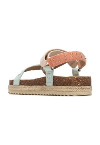 Sandales multicolores avec une semelle en liège. Présentent des brides en daim couleur pêche, menthe et beige, ainsi que des clous décoratifs en métal. Bordure en jute tressée.