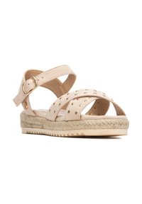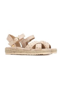 Sandale beige avec une tige en tissu texturé, des accents cloutés et une bride réglable à la cheville sur une semelle compensée style jute. Semelle extérieure plate en caoutchouc antidérapante.