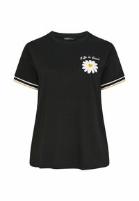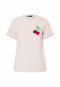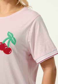 Femme blonde portant un t-shirt rose clair avec une broderie de cerisier sur la poitrine et un jean bleu, posant avec une main dans la poche.