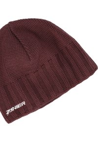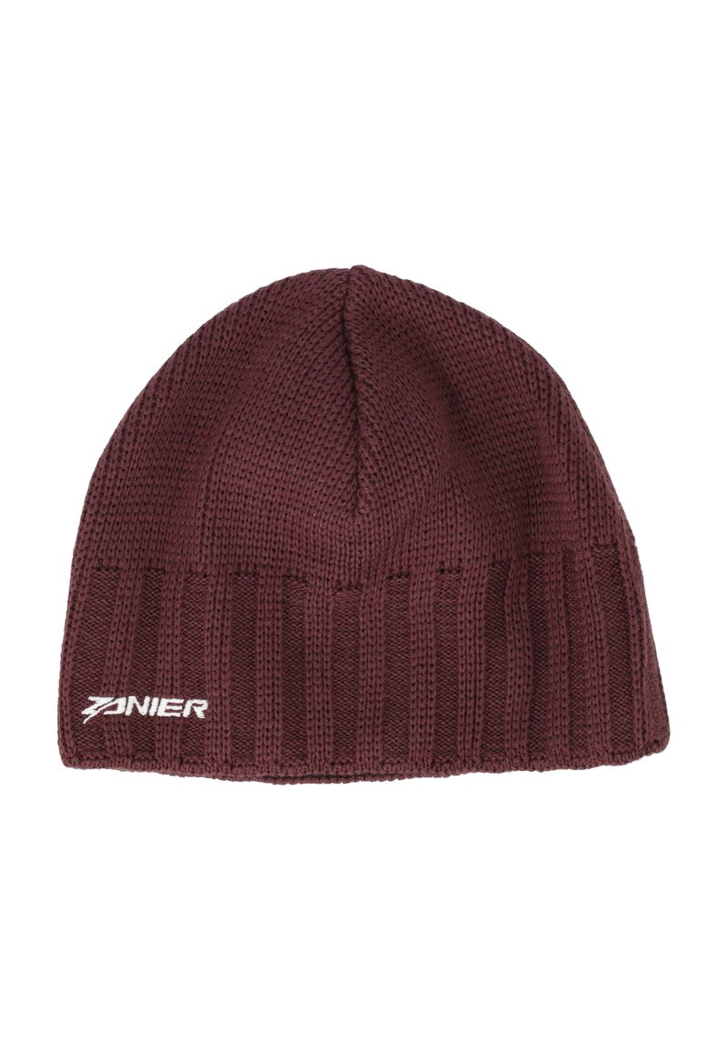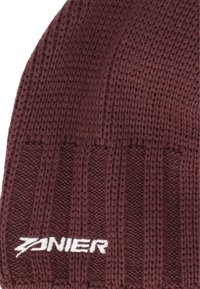 Bonnet tricoté bordeaux avec revers côtelé et logo "Zanier" blanc brodé sur le poignet, présenté sur un fond blanc.