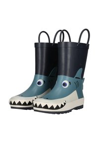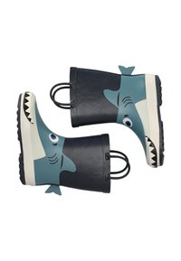 Botte de pluie en caoutchouc pour enfants, bleu et noir, avec un visage de requin, des détails de nageoire et de queue, et deux poignées de traction sur le dessus.