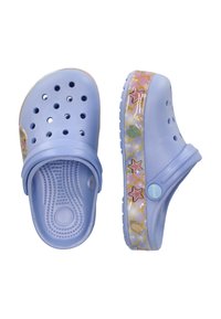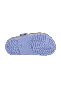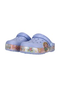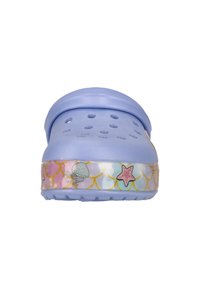 Sabot violet clair avec des trous d'aération, avec une sirène et des décorations sur le thème sous-marin sur la bride de la semelle avec une sangle réglable.