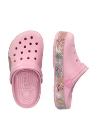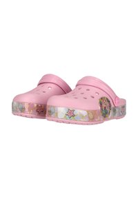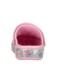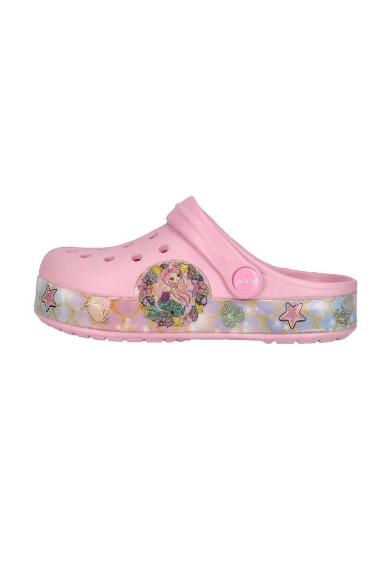 Sabot rose pour enfant avec bride réglable au talon, trous ventilés et décorations sur le thème de la mer comprenant une sirène, une étoile de mer et des coquillages sur la semelle.