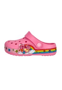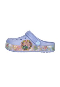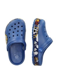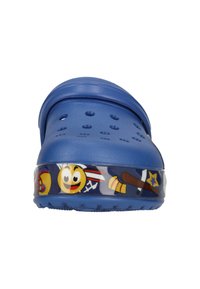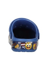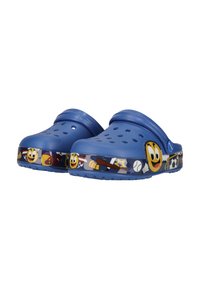 Sabot bleu avec des trous de ventilation et une semelle à motif avec des icônes sportives ludiques et un visage emoji souriant.