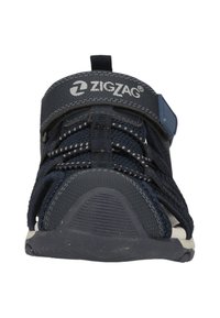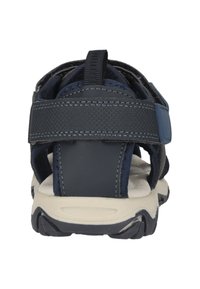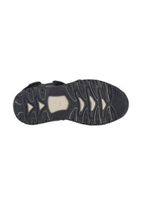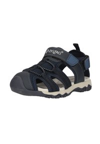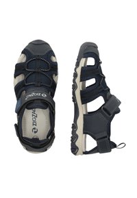 Sandale d'extérieur bleu marine et noire à bout fermé, avec des sangles réglables et une semelle beige robuste.