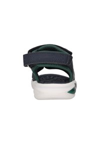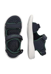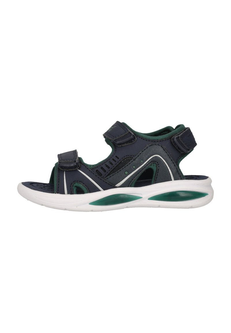 Sandale d'enfant bleu marine et verte à bout ouvert avec des sangles ajustables et une semelle blanche coussinée avec des accents verts, vue de côté.