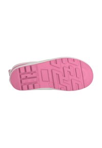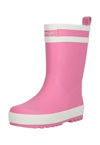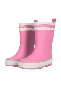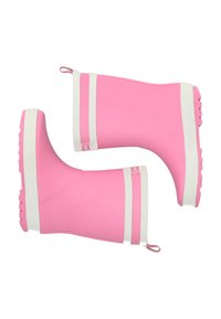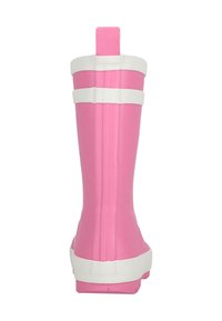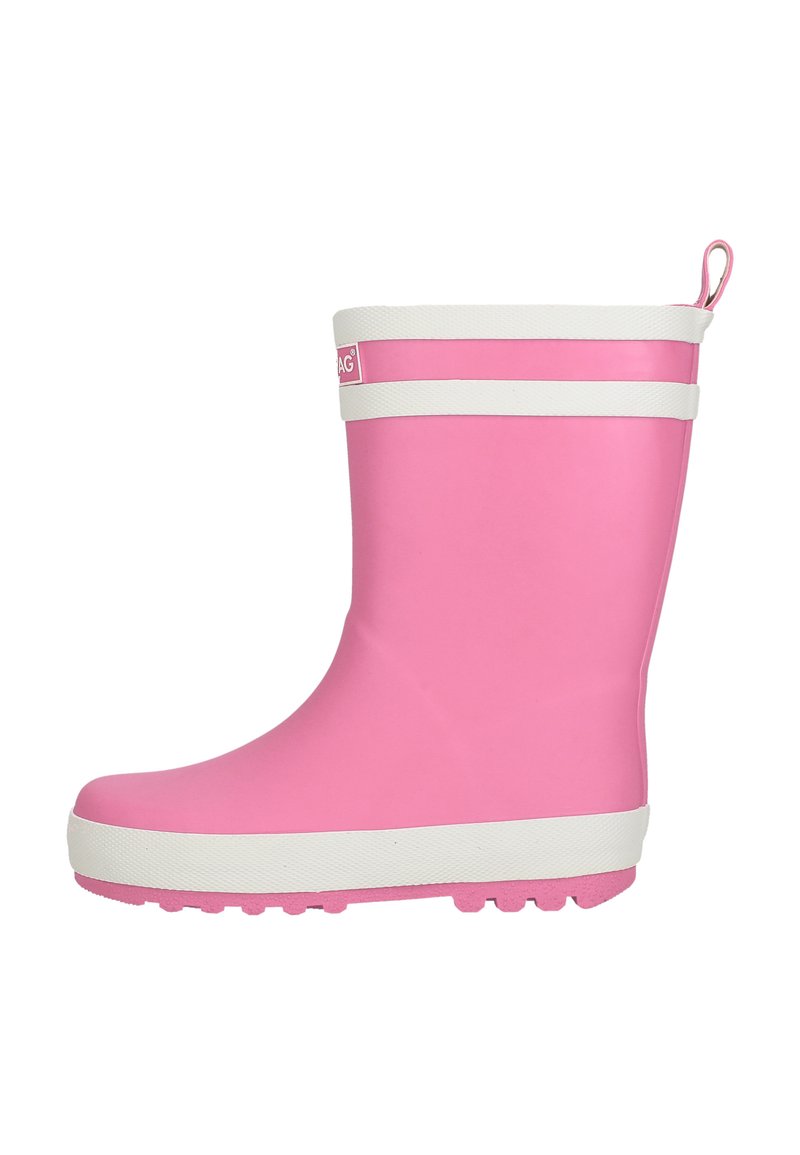 Botte de pluie pour enfants rose avec bordure blanche autour du haut, de la semelle et un onglet de tirage à l'arrière, vue de profil.
