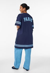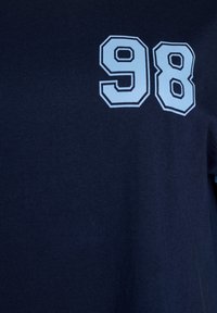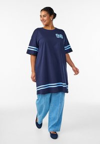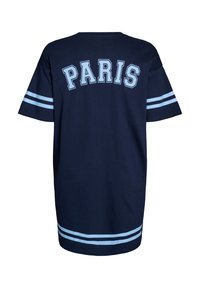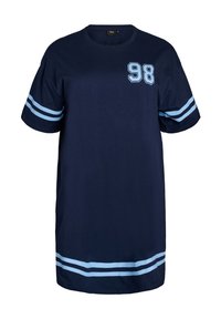 Femme souriante portant une robe ample bleu marine avec des rayures bleu clair sur les manches et l'ourlet, et le numéro 98 sur la poitrine.